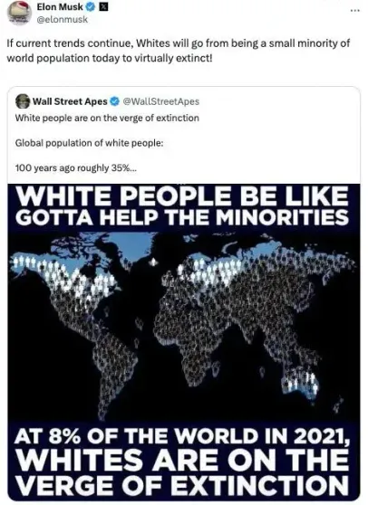Основатель Tesla и Space X Илон Маск, который часто высказывается о снижении рождаемости, заявил, что белое население мира находится под...